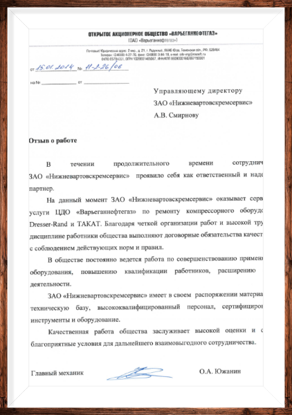с ОАО «Казанькомпрессормаш» реализован проект по замене компрессора 5ГЦ2-240 на КС-2 Приобского месторождения ООО «РН-Юганскнефтегаз», предназначенной для сбора и транспортировки попутного нефтяного газа. Силами АО «Нижневартовскремсервис» в сжатые сроки осуществлен демонтаж-монтаж компрессорного оборудования с заменой основания и переобвязкой технологических трубопроводов. Произведены пусконаладочные работы и запуск компрессора в эксплуатацию.