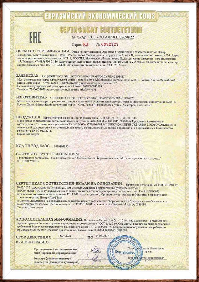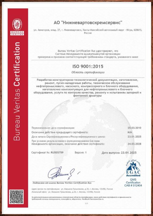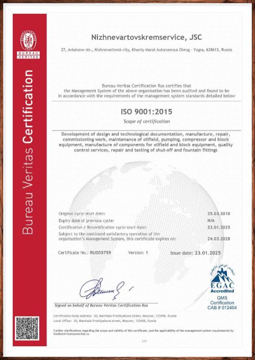 Система менеджмента компании проверена и признана соответствующей требованиям стандарта ISO 9001:2015 в области сертификации: разработка конструкторско-технологической документации, изготовление, ремонт, пуско-наладочные работы, техническое обслуживание нефтепромыслового, бурового оборудования и оборудования для подземного и капитального ремонта скважин, изготовление комплектующих для нефтепромыслового и бурового оборудования, услуги по проверке качества запорной и фонтанной арматуры. Имеются и другие подтверждающие разрешительные документы: cистема менеджмента безопасности труда и охраны здоровья, cистема экологического менеджмента.